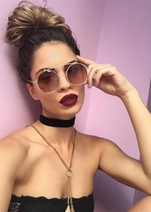 As a rule, the finish is different from the color of the choker. It is the accent of a concise necklace and is often performed in the style of minimalism. These decorations perfectly complement urban everyday bows and are a success with young people. And the narrower the style, the more versatile the choker. This design will allow you to combine it not only with different clothes, but also to combine it with other jewelry (chains, pendants).