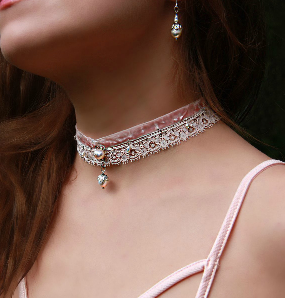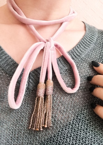 Models with knitted decor add luxury to the design. This necklace looks quite elegant and aristocratic. Lace goes well with velvet, and if there is a stone or a bead in the same palette as velvet, the effect will be luxurious. Decoration can be an accent evening dress.