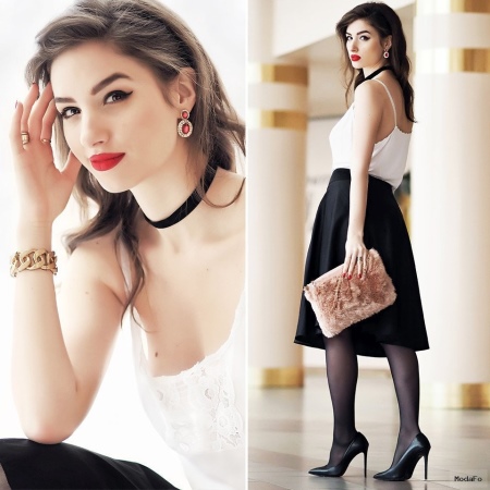 If you want classics, you can wear a black choker with a strict satin blouse and a straight or flared cut skirt without too much decoration.