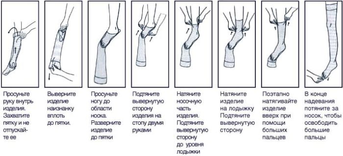 First you need to properly install the toe stocking, then slowly stretch it along the leg. When the stocking is worn to the desired length, it is necessary to straighten the gum on top. When putting on stocking you need to be very careful not to accidentally do a nail tightening.
