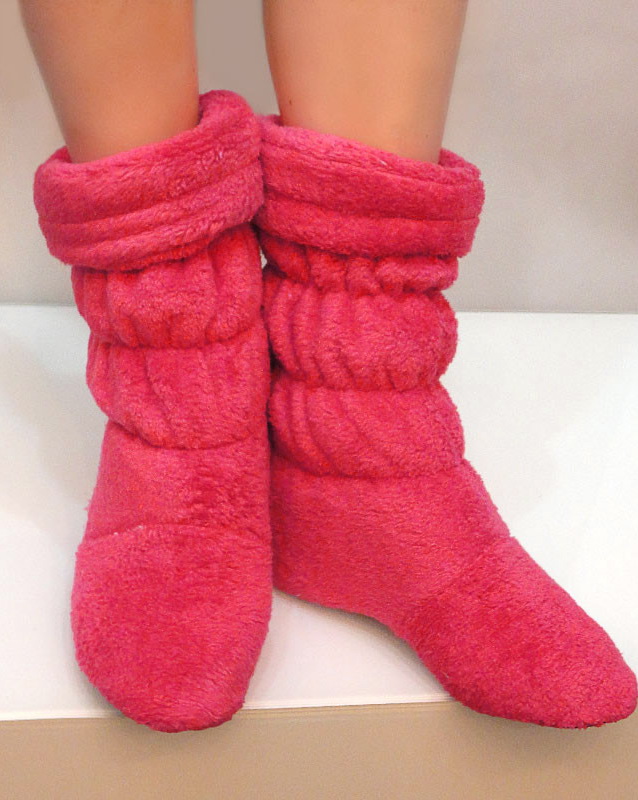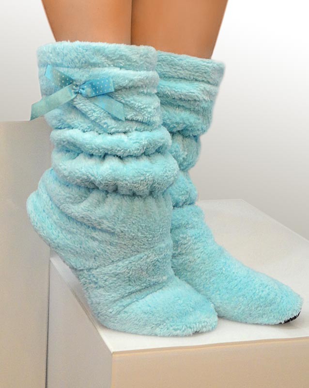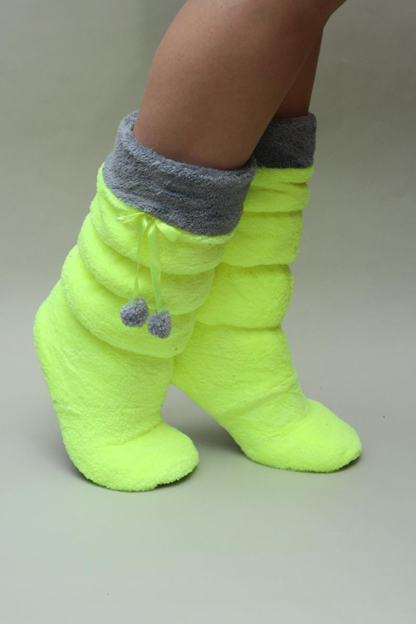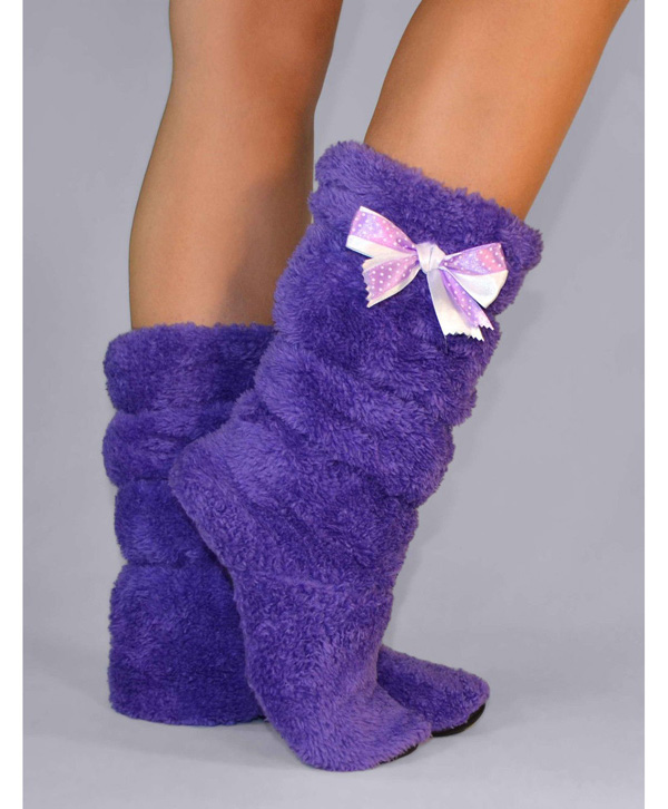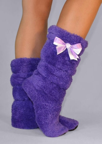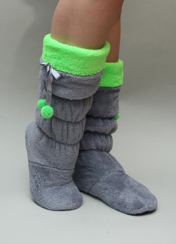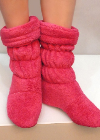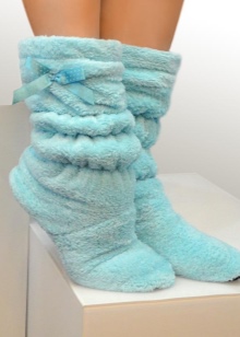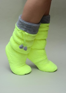 - Socks, boots - are homemade uggs from a warm mat and fleece insulation. Have a hard sole and height to the middle of the calf. Decorated with pompoms, ears, bows. The color range is different, complemented by original prints.
