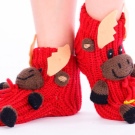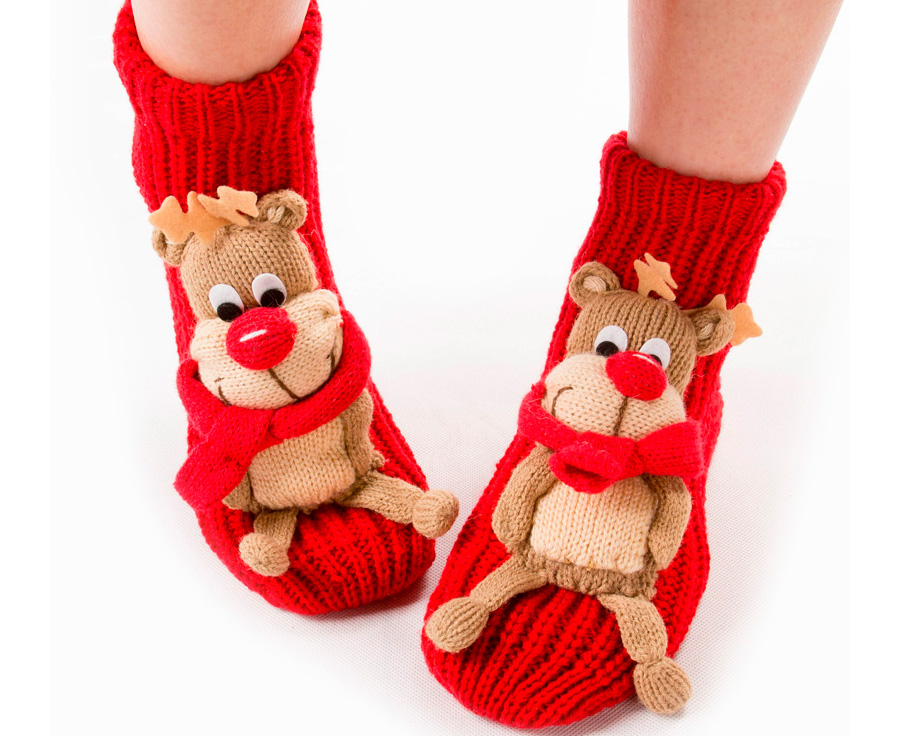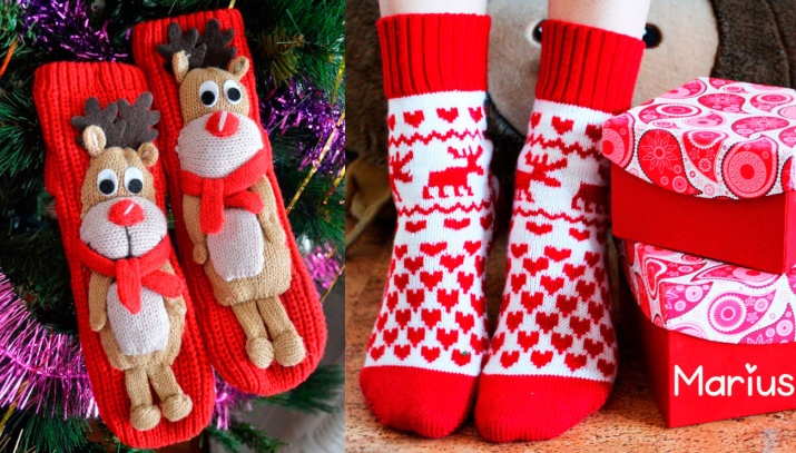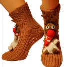 Skilled craftswomen knit socks with knitted deer. They look very colorful and festive. Such "slippers" will appeal not only to children.