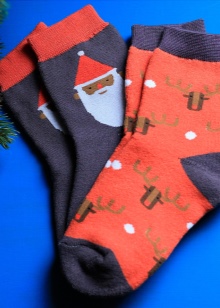 Socks combining white, blue, sand, dark blue and red colors look very bright and colorful. Products for adults are made of black, gray, brown and beige yarn.