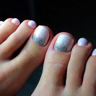 Pedicure with sparkles is chosen by girls who want to impress everyone around with their chic look. Glitters come in different sizes, shapes and different colors. Glitter nail design can be done in the classic french style, drawing a strip along the edge of the nail plate, or moon pedicure, highlighting the holes, decorate one nail, or fold a certain pattern on the nails with glitter. Particularly impressive is a pedicure with glitters of blue and blue, lined with vertical or horizontal stripes.