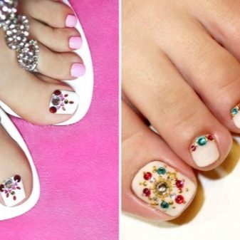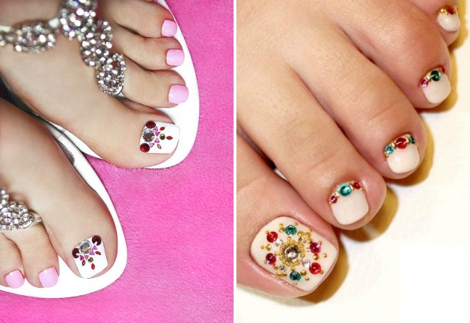 Rhinestones are a very successful decoration for the nails of your legs, their sparkling shine provides a chic appearance and is able to hide the imperfect shape of the nails. Such a pedicure can be made rich in bulk on all nails, framed on the edge of the nail plates, and you can make decoration with just one crystal for each nail. The composition of flowers or an openwork pattern, complemented with rhinestones, looks very original. The crystals can be used in different colors and different sizes, and can be supplemented with silver or gold broths.