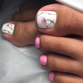 You will get the perfect combination by combining white and pink in a single composition, this pedicure will suit a girl with a romantic character, emphasizing her delicate nature. The white and pink nail cover goes well with a floral print and will perfectly fit into spring and summer style. With such a pedicure, it is necessary to withstand a mandatory condition - pink color should be present only in one of the items of clothing or accessory.