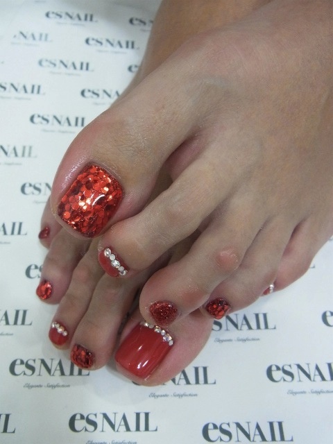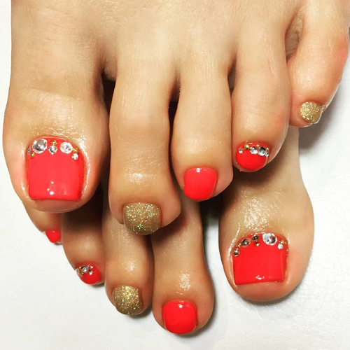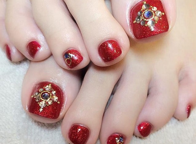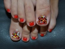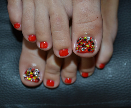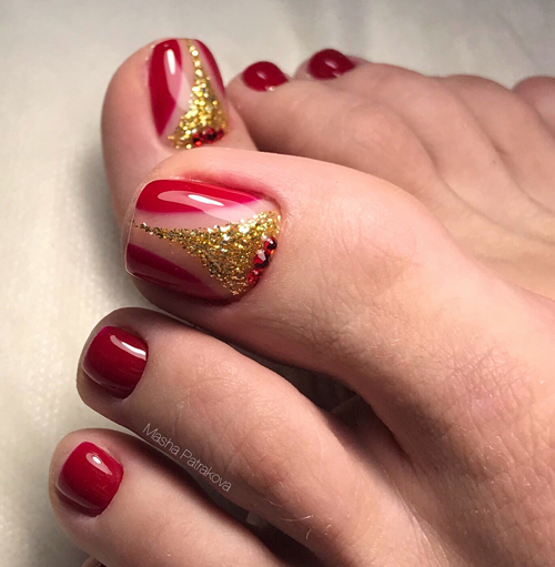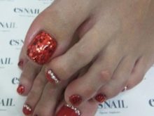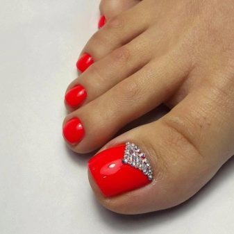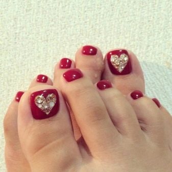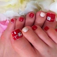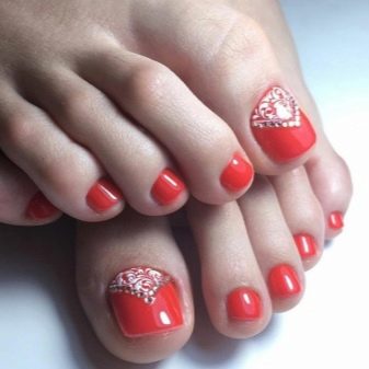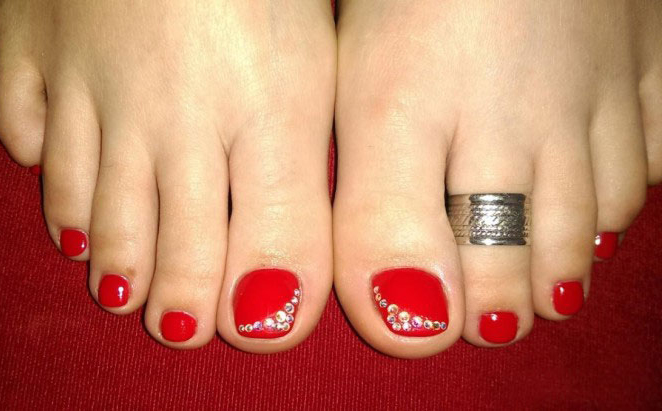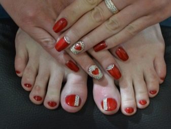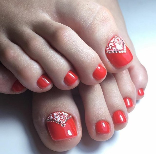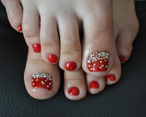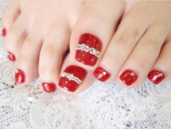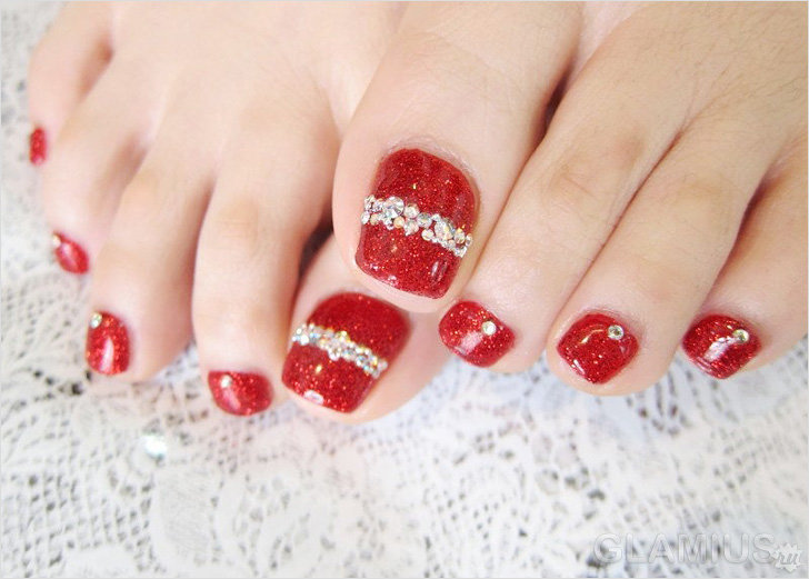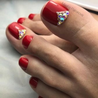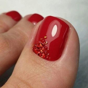- An abundance of luxury to your fingertips. This type is very peculiar, because a red pedicure almost completely covered with various stones is far from a casual look. This pedicure is suitable for a festive event, but it is worth and tense with a selection of clothes.