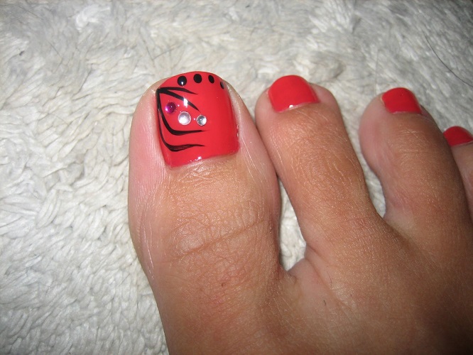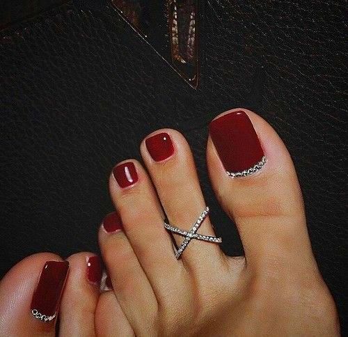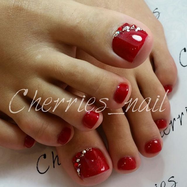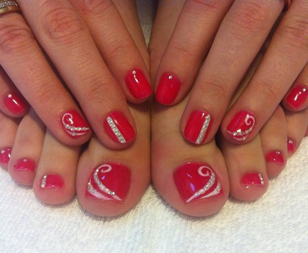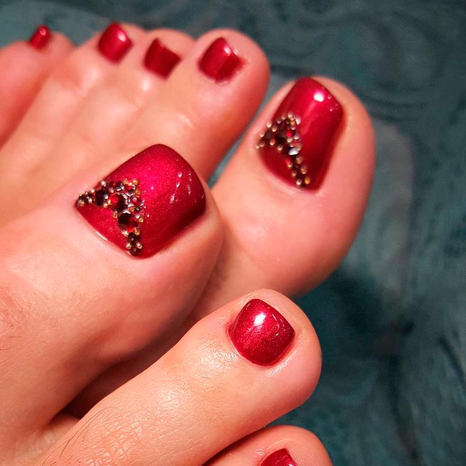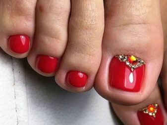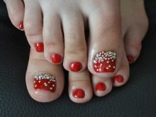 When creating a red pedicure with rhinestones, give yourself a free will, there is plenty of room for roaming around. You can add stencils, creating a volume, cute bows and flowers, a gradient, funny pictures - all this will allow you to show your individuality.