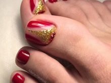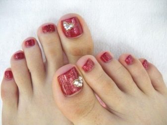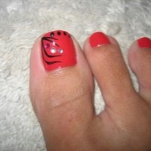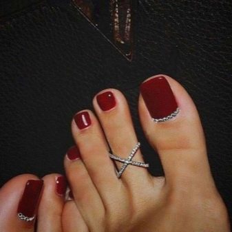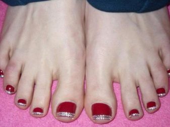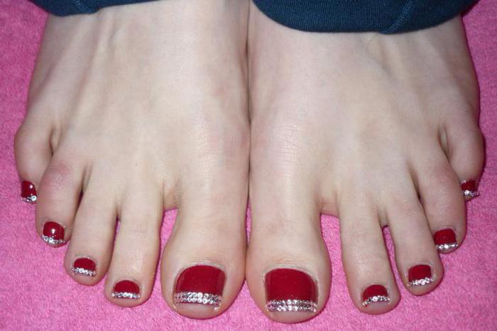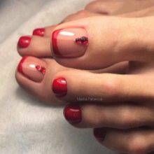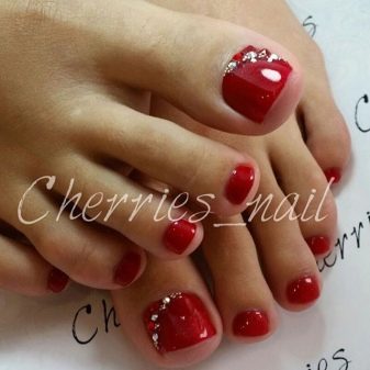 By itself, red pedicure looks very impressive and beautiful, but if the design is complemented with rhinestones, then there is a danger to blow everyone away. There is a huge number of rhinestones of various colors and shapes, today any salon can demonstrate at least a couple of dozen variations of a pedicure with their use. For connoisseurs of this type of stones, the separation does not end only in color and size.They deepen and notice the difference in the cut and even the degree of transparency of a particular type of rhinestone. Plastic rhinestones are considered the cheapest, but a manicure with their use will immediately give you the size of your wallet and a desire to save on yourself. In addition, they are not so practical, because after a short period of time, such decor falls off or dims, leaving behind only the memory of the old beauty.