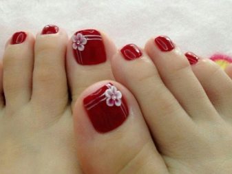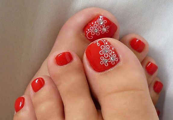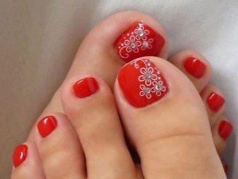 - Romance - one of the favorite female motives. Of course, we are accustomed to the fact that red is more a defiant shade, but with the right design it can be unusually tender. To create a romance on a red pedicure, it is enough to add a floral print and 1-2 rhinestones - this will completely change his perception.