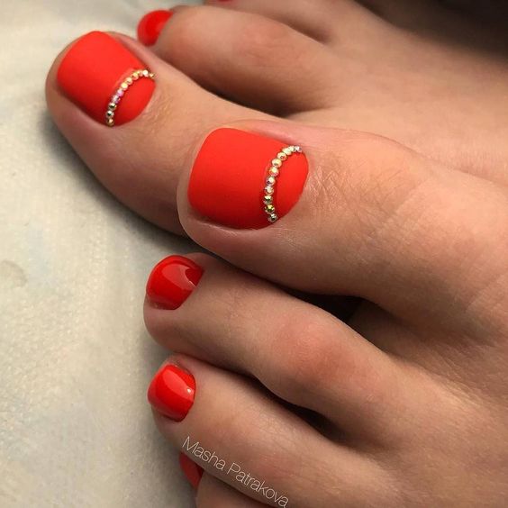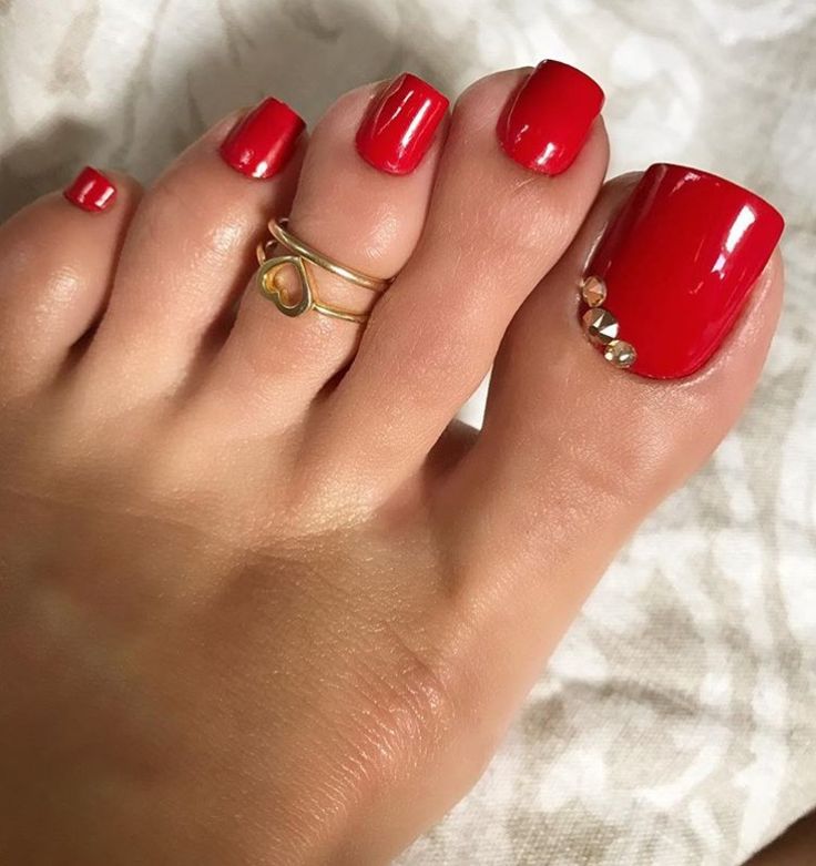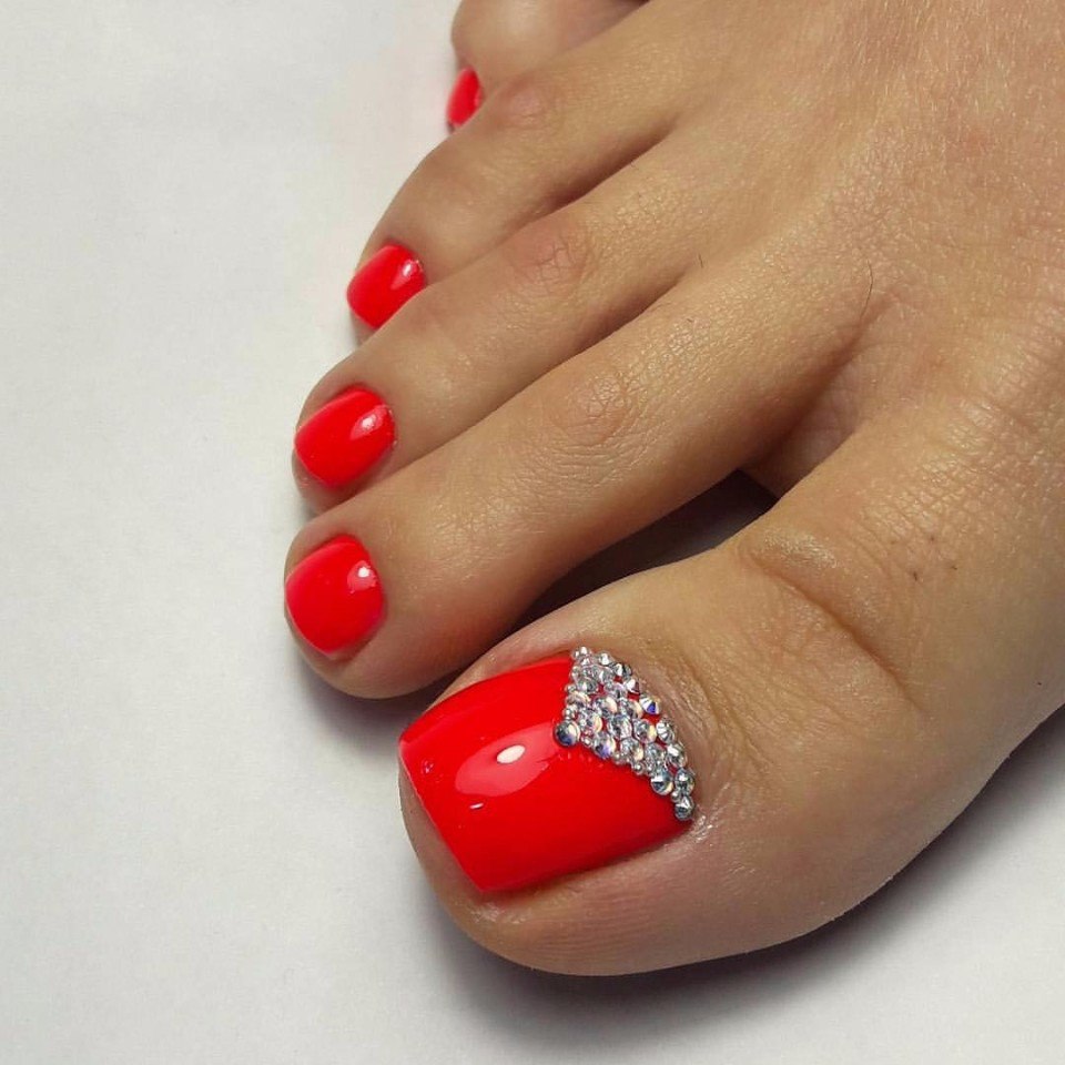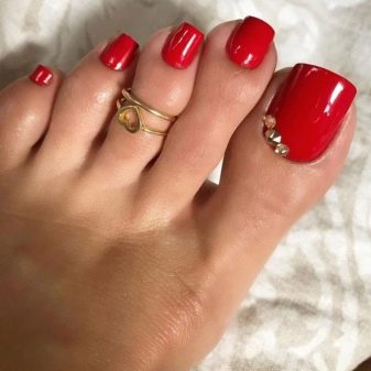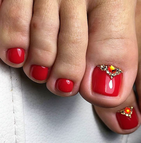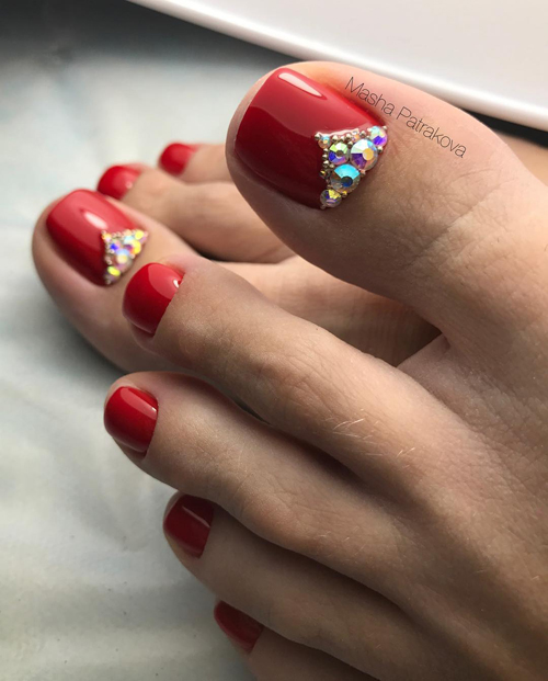 Unfortunately, fashion is changeable and changeable, like women themselves, which is why there are no certain shades in clothes or manicure with a pedicure, to be always in trend. But even in this rule there are small exceptions, there are several classic shades with which you will always be at your best, and red is one of them. This color is always in the spotlight and at the peak of popularity, regardless of the season. The only thing that can change is the direction. Considering all the subtleties, a red pedicure with a small drape of rhinestones can unmistakably be called a winning or ideal option under any circumstances.
