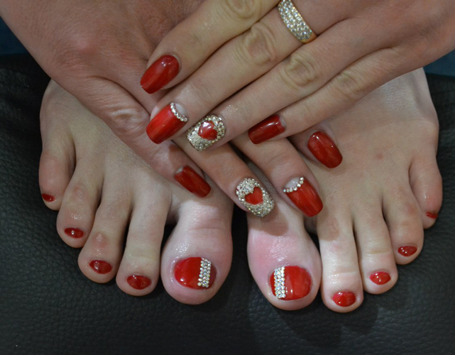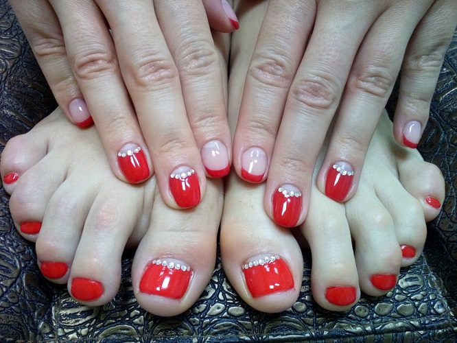 To learn how to make red manicure and pedicure with rhinestones yourself, see the following video.