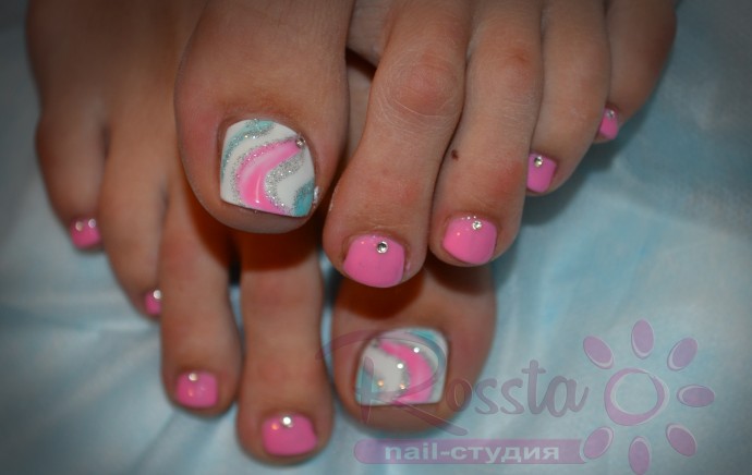Today there are a lot of interesting pedicure ideas. The most common option is to design rhinestones. This decorative element can be of any size, shape, or even color. In combination with pink rhinestones look rich. However, we must adhere to some rules so that the legs look perfect: