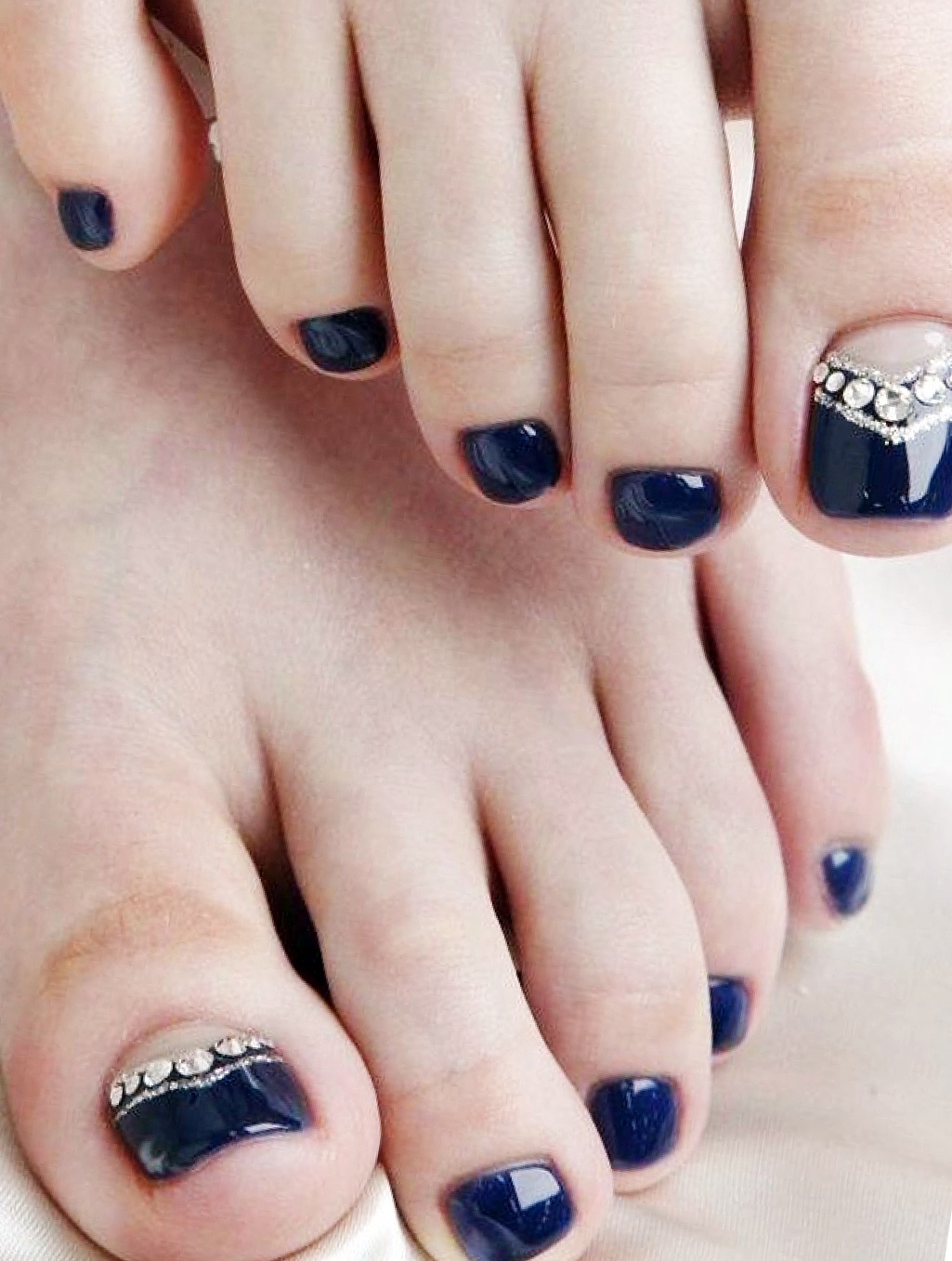 - Blue. Dark blue pedicure is considered close to black, but it looks more cheerful and rich. Pay attention to this color when choosing a decor for a trip to the sea. Such a design would be appropriate to look with shoes in both light and dark shades. Perfect harmony is guaranteed with clothes and accessories in shades of blue. Masters of nail service note that this color is also versatile and successfully combined with other colors, like black. Color can be added with various elements. With a cold tone silver elements and white, transparent stones will look great.