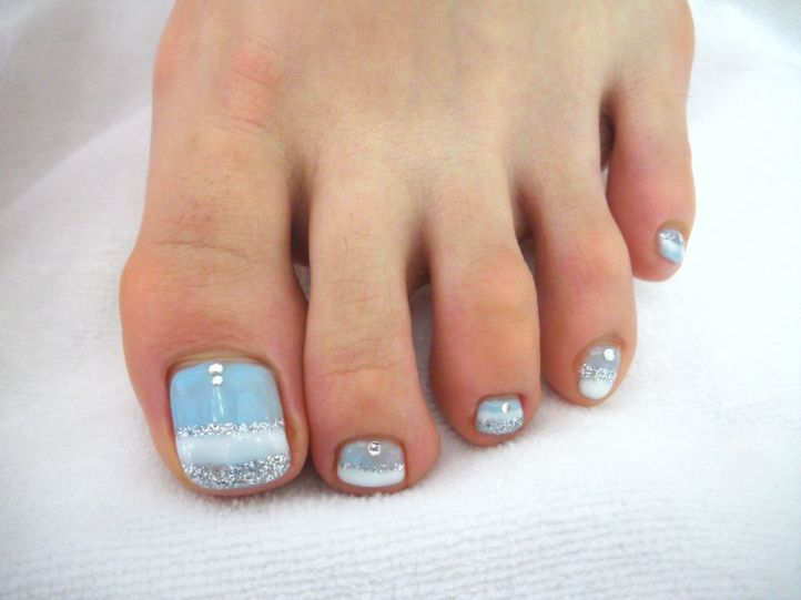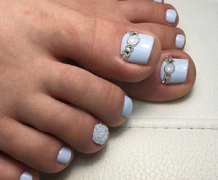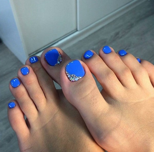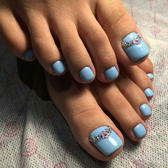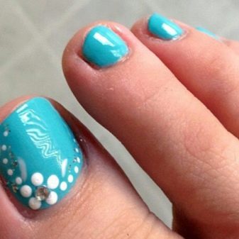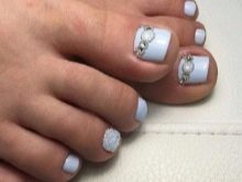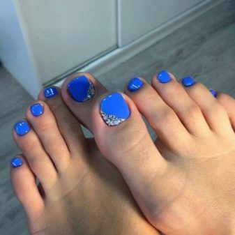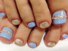 - The pedicure in blue shades with rhinestones looks original. Nails acquire a noble and refined look. Such a pedicure is appropriate for both everyday and more solemn.