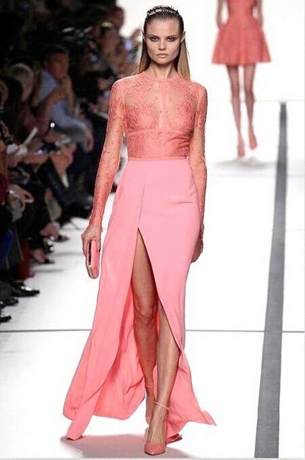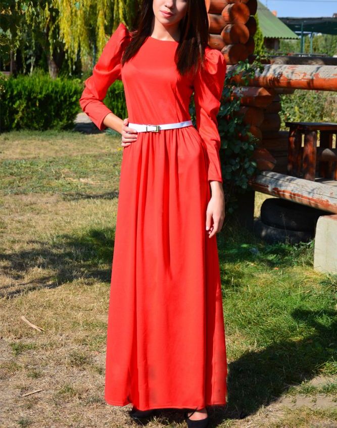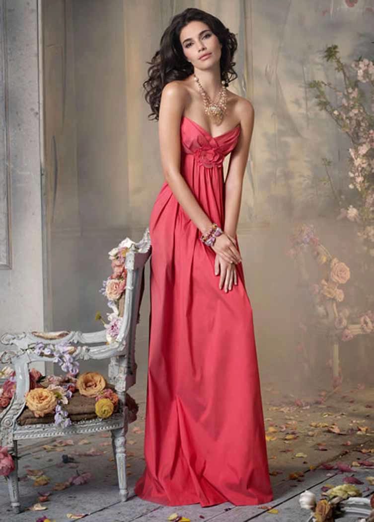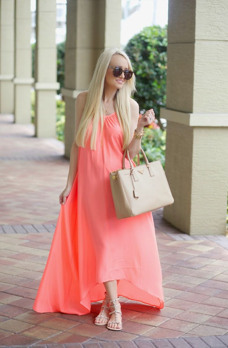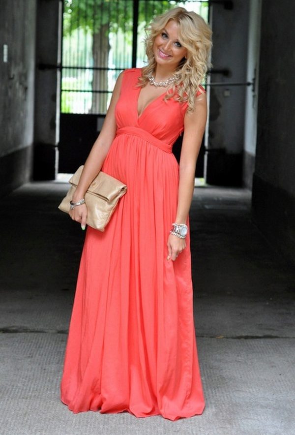 A long coral dress is the embodiment of luxury, femininity. Its advantage is that it is a representative of the classics, along with white and black. In addition, you can use the strap, which is in harmony with the shoes. Good look strap, shoes and clutch in white. Especially with the dress, in which there are draperies and folds.