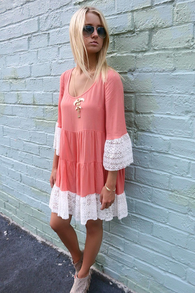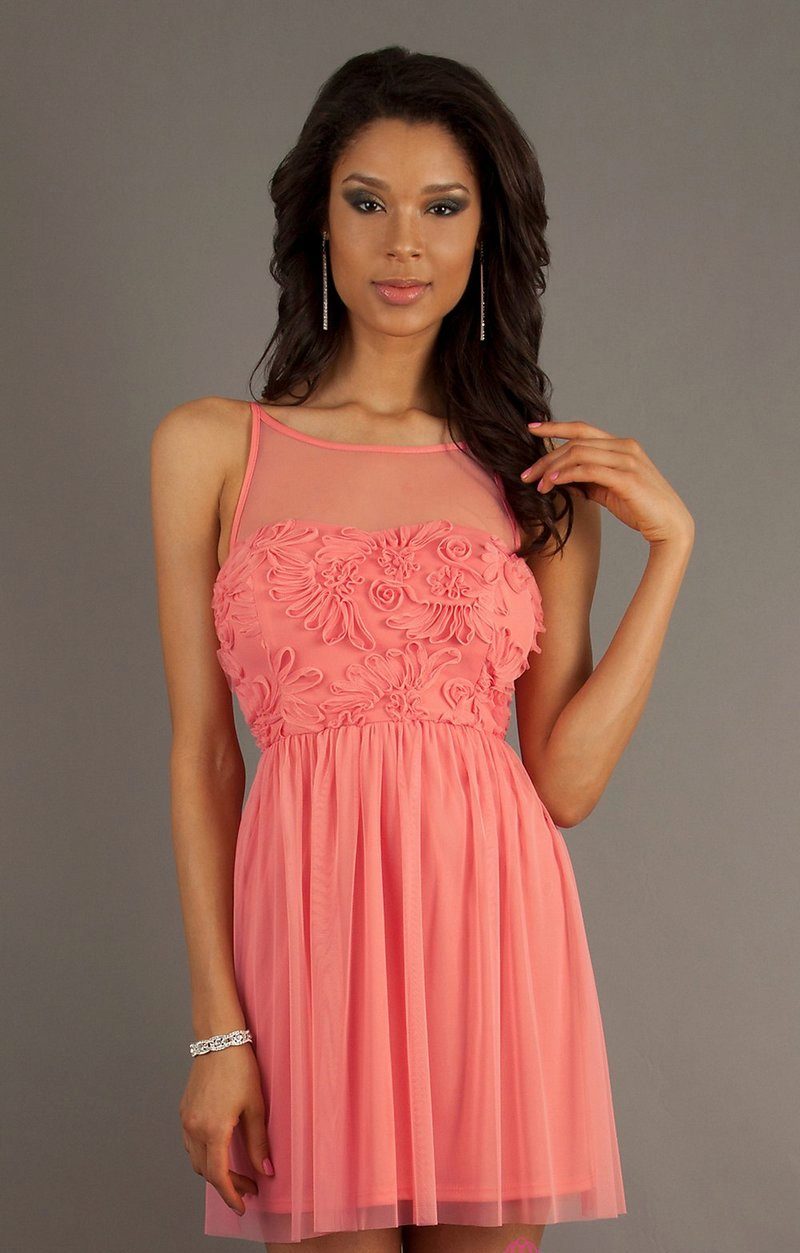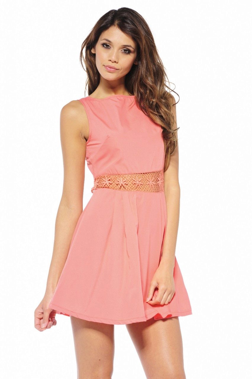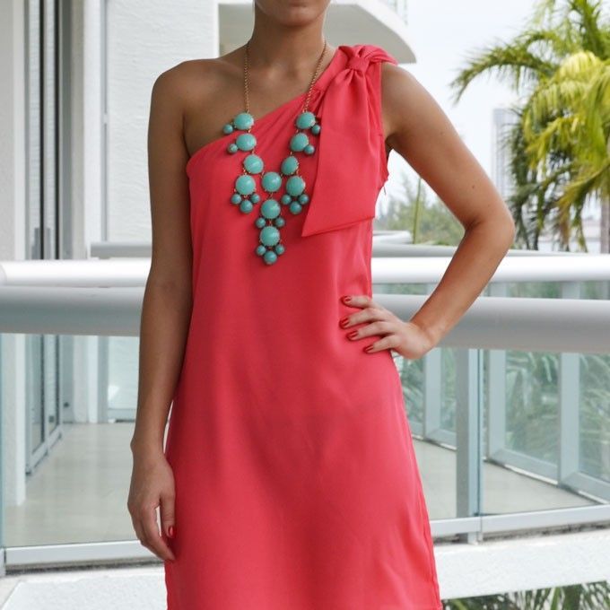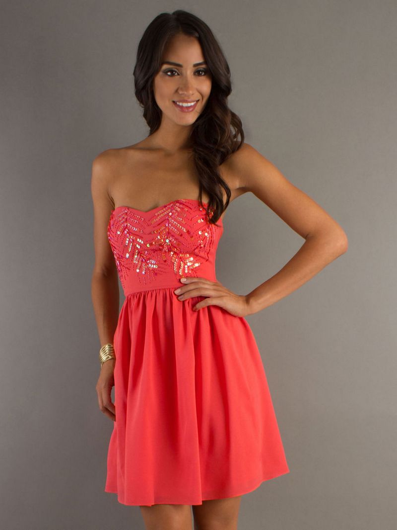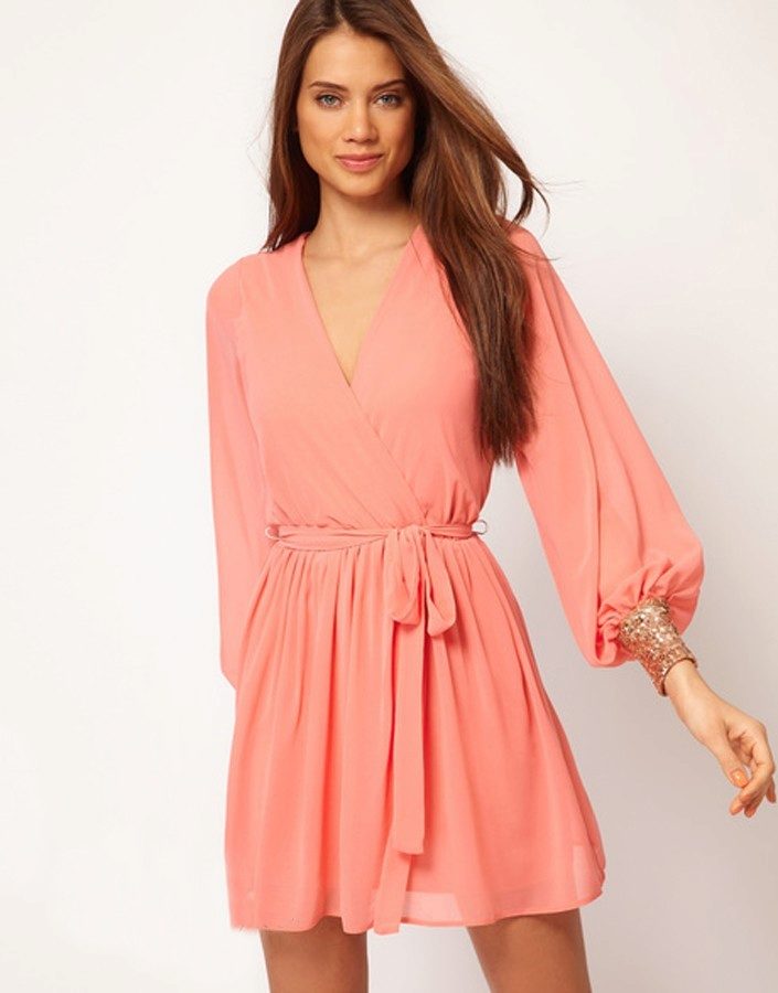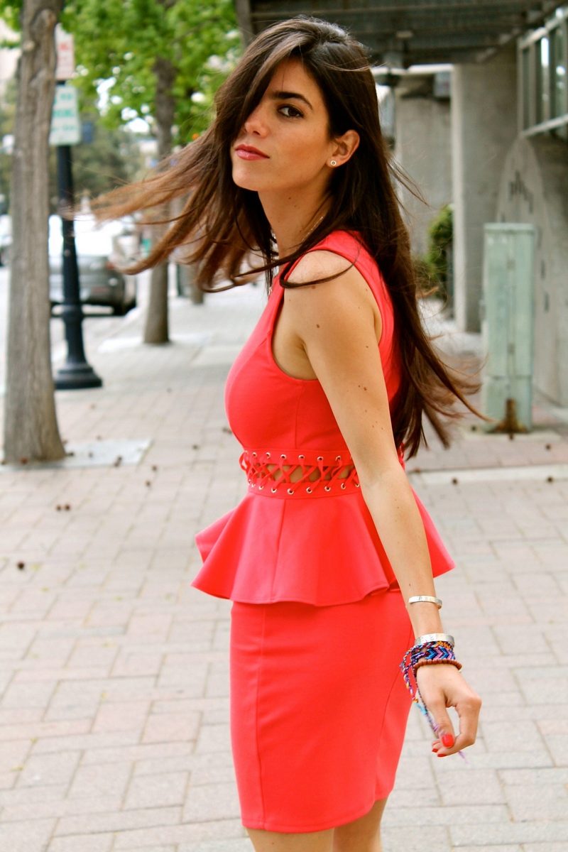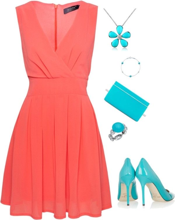 A short coral dress creates a pretty look. The use of this attire is universal. Whether it be a cocktail or casual outfit, it will emphasize your tenderness.