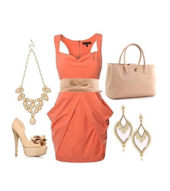 Light brown sandals, a brown bag and a belt are a great addition to a coral dress. This is an image for going to the cinema, walking, having a party.