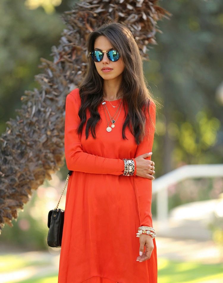 Red-orange coral. It is characterized by saturation and warmth. A dress of this shade is suitable for absolutely everyone - and blondes, brunettes, and brown-haired women. The occasion on which you can use the red-orange coral is also universal - walk, work, rest, holiday.