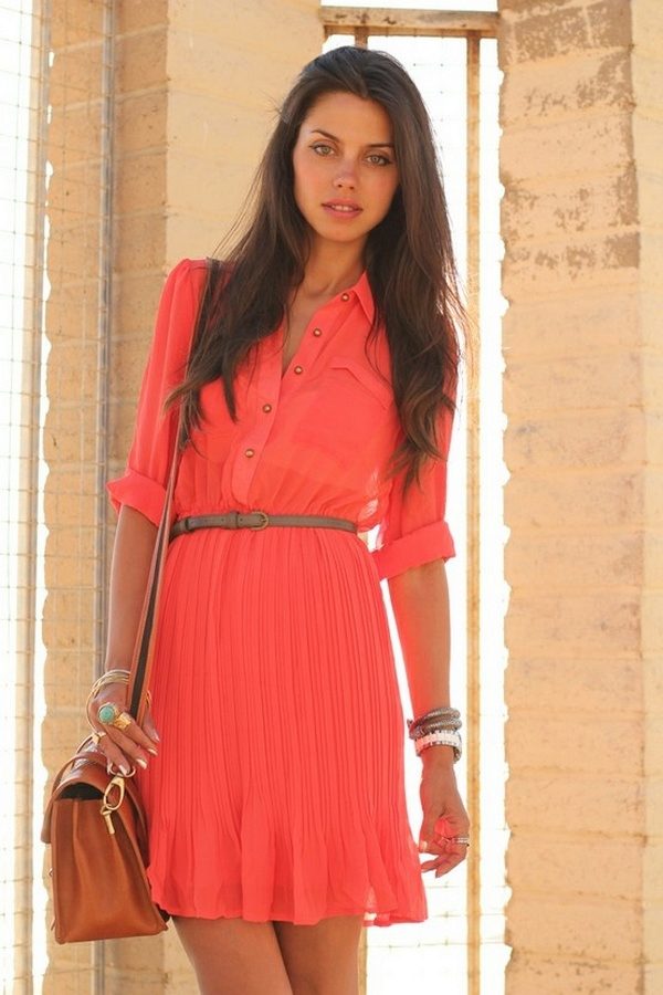 A coral shirt dress can be a very interesting and stylish solution for everyday life. For accessories, choose a brown bag and shoes.