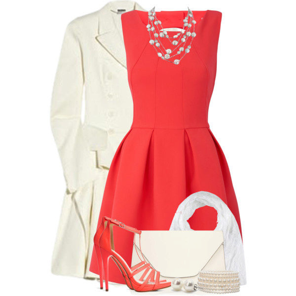 Red shoes and coral dress - a good combination. Only shoes should be with high heels. Spectacular image for a party or a momentous event.
