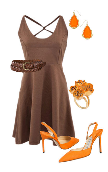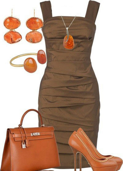All shades of gold will look great with a brown outfit, so you can simply put on your favorite gold earrings or bracelet. Ornaments made of stones, such as turquoise or coral, are well suited to a brown dress. Leather belt and satchel handbag will be the final touch.