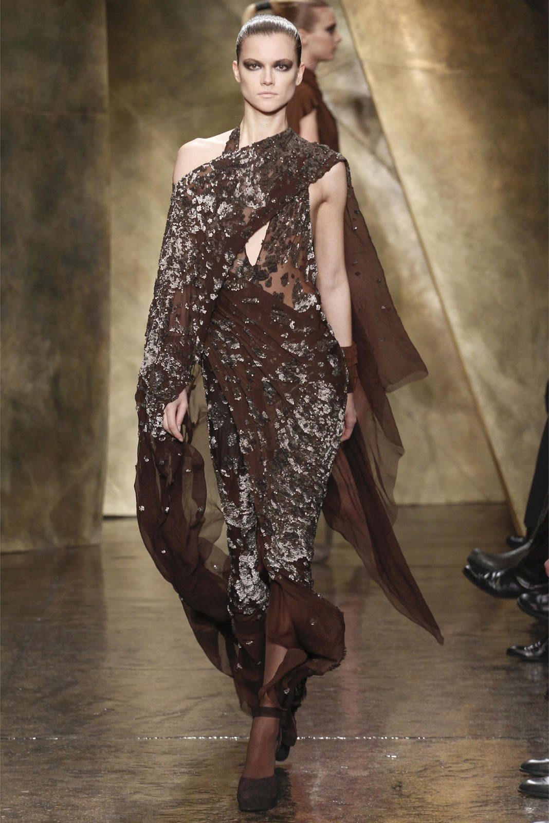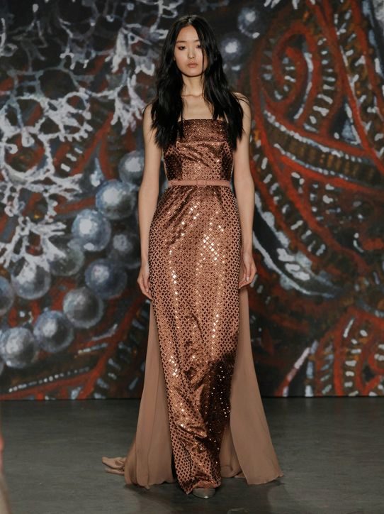 Fabrics with glitter are often used to sew long evening dresses, and in the case of brown, this technique is more than justified. The fabric gleaming at artificial light perfectly smoothes some restraint and coldness of brown color.
