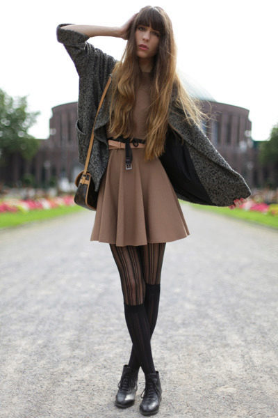 What tights to choose for a brown dress depends on the shade of the dress. If the dress is light brown, it is worthwhile to dwell on dark pantyhose - chocolate or even black. With a dark brown dress is better to wear light tights, for example, beige or milky shade. Patterned tights will effectively look with a concise dress of a simple cut.