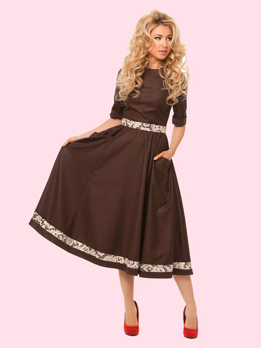 Brown dress with a skirt above the knee, many will cause associations with school uniform. Some girls like this comparison, and they gladly complement this outfit with a snow-white collar.