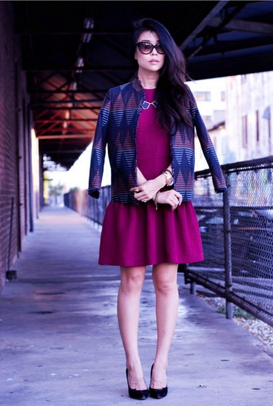 The shortest mini dress of crimson shades will help to change to a club or a party with friends. A juicy apple-colored jacket in addition to a crimson dress is simply not replaceable to create a fresh summer look. Shoes in tone of a jacket will finally place color accents.