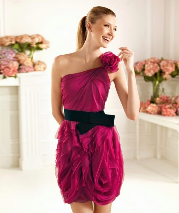 For lovers of experimenting with clothes, designers offer crimson dresses with asymmetric cut. At first glance, it is sometimes difficult to determine an intricate style or how to wear this dress. But do not rush to abandon this option. This dress is necessary to try on, in order to realize the design idea.