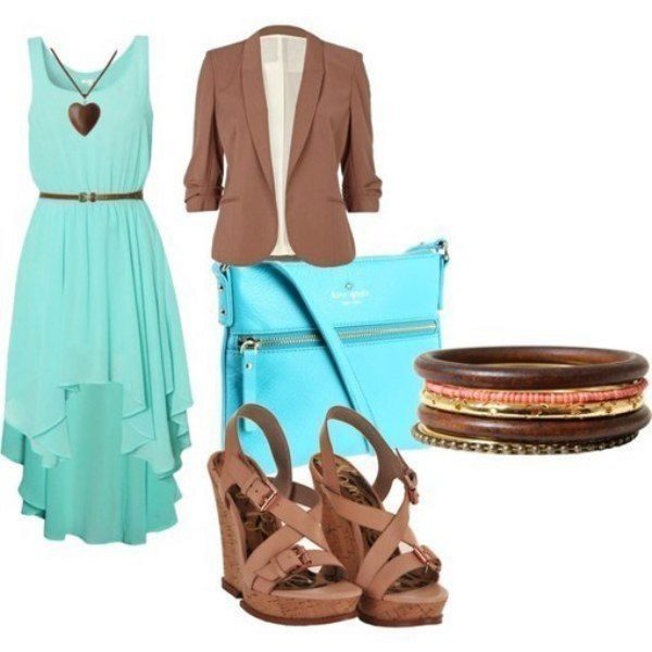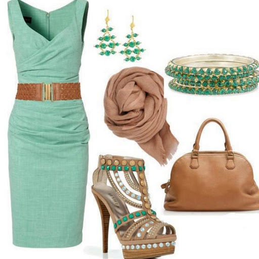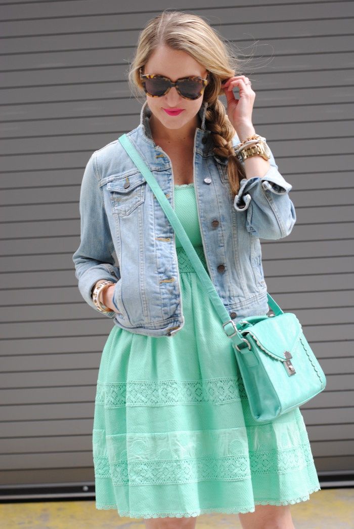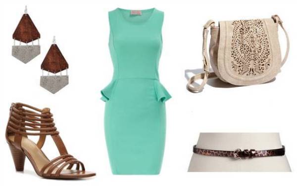 - The best addition to the mint dress is considered to be accessories of beige color, snow-white jacket, and also a thin brown strap.