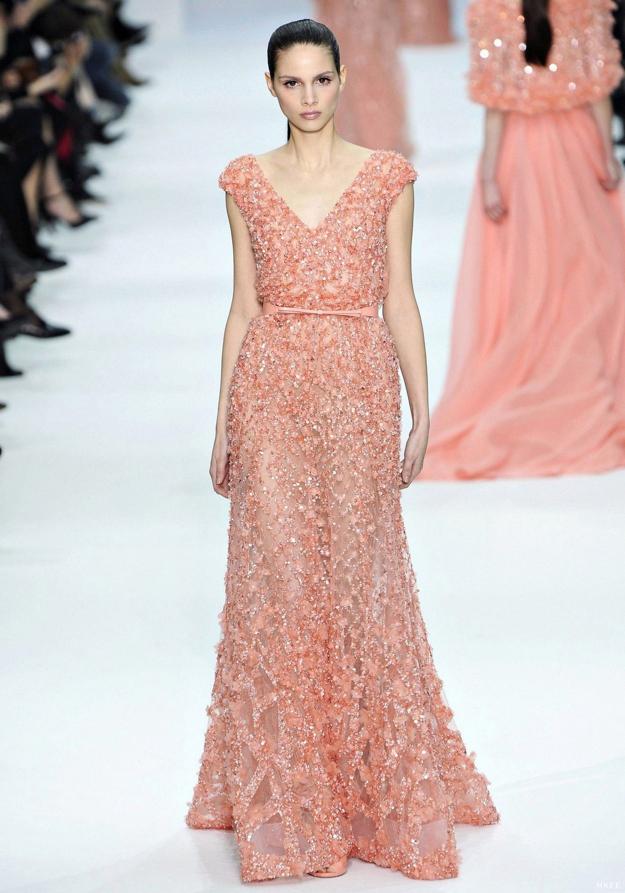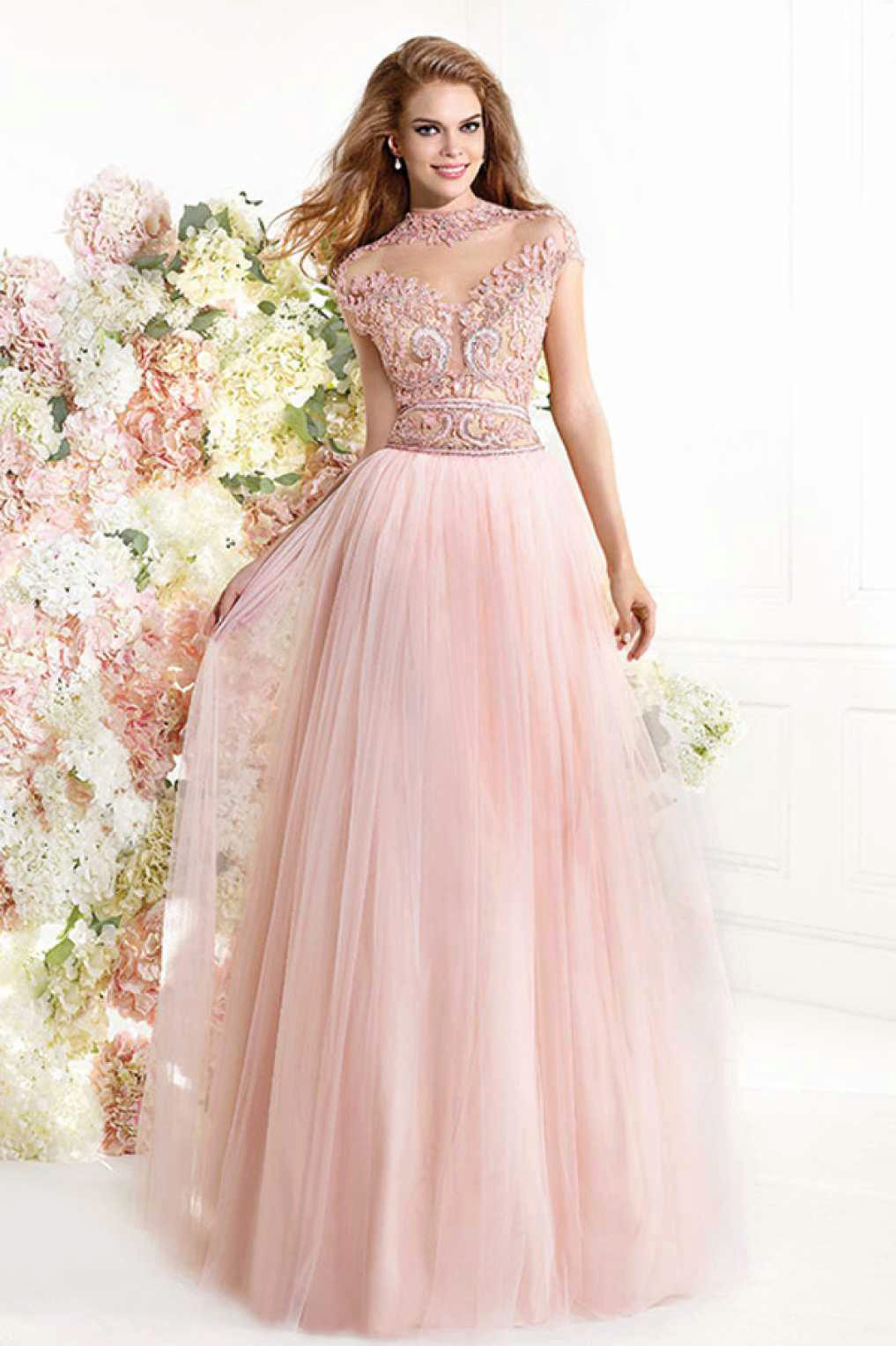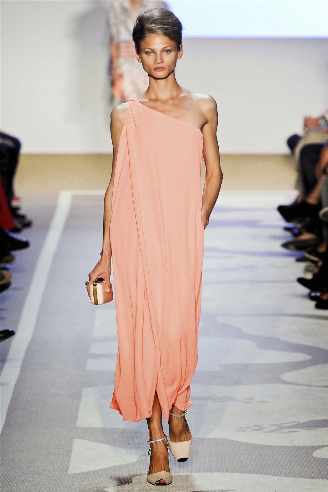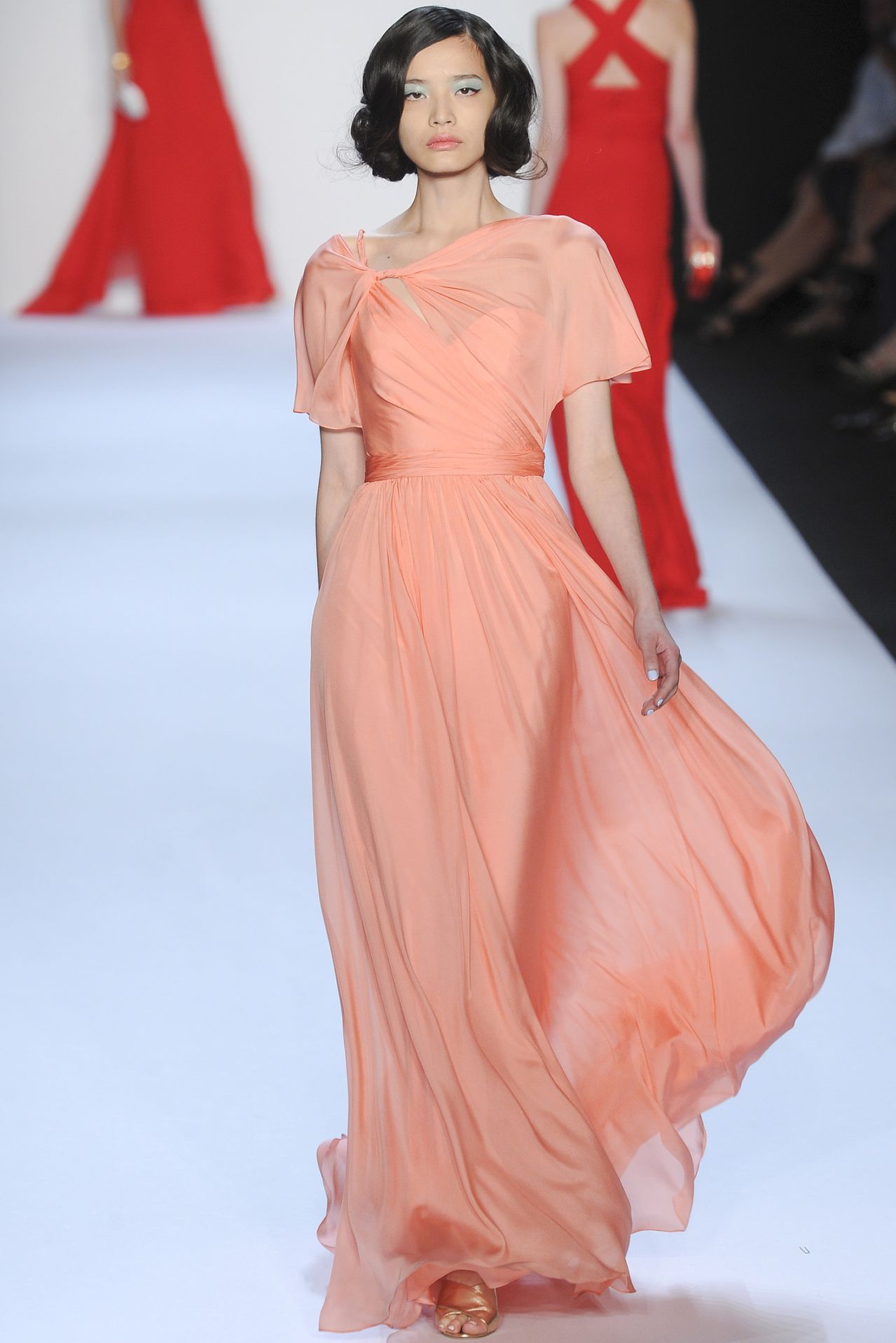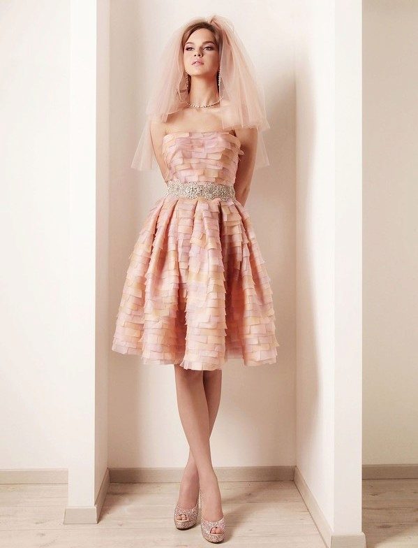 Models of peach dresses with A-silhouette help to visually lengthen the legs.