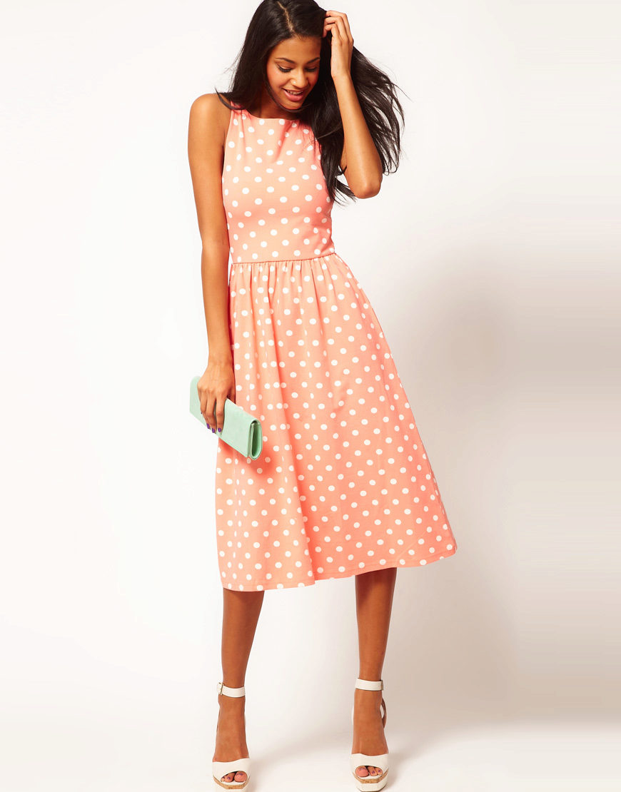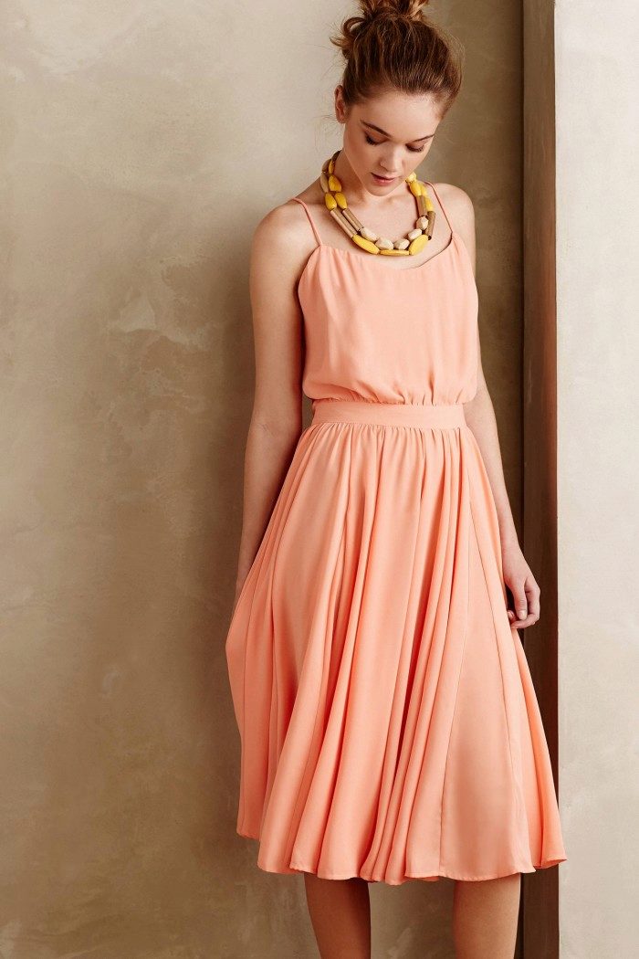 Peach outfit of chiffon with medium length can be put on a romantic meeting, and can be made the basis of an image for a graduation party or even a wedding. Silk dress of medium length in peach color is perfect for going to an exhibition or to the theater.