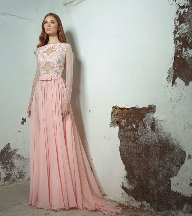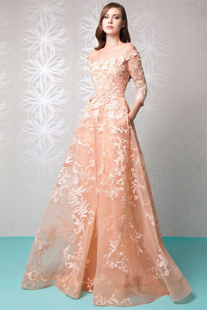 Taking into account the purpose of the dress, the sleeve may be completely absent or be represented in different lengths. Evening dress in peach tone can be limited to both elegant straps and lace inserts, as well as flowing long sleeves from the same airy fabric as the dress itself.