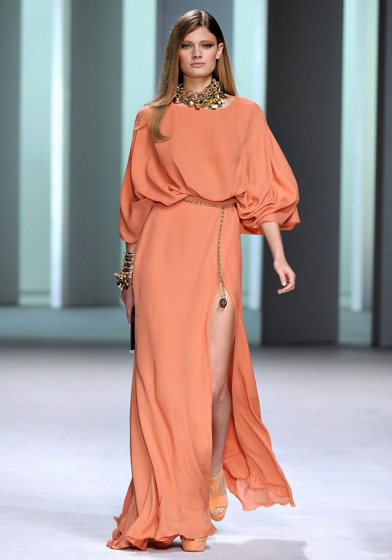 A long dress in peach tones will have the most spectacular appearance if it is sewn of flowing fabric, or, conversely, of a sufficiently dense material forming an abundance of refined folds.