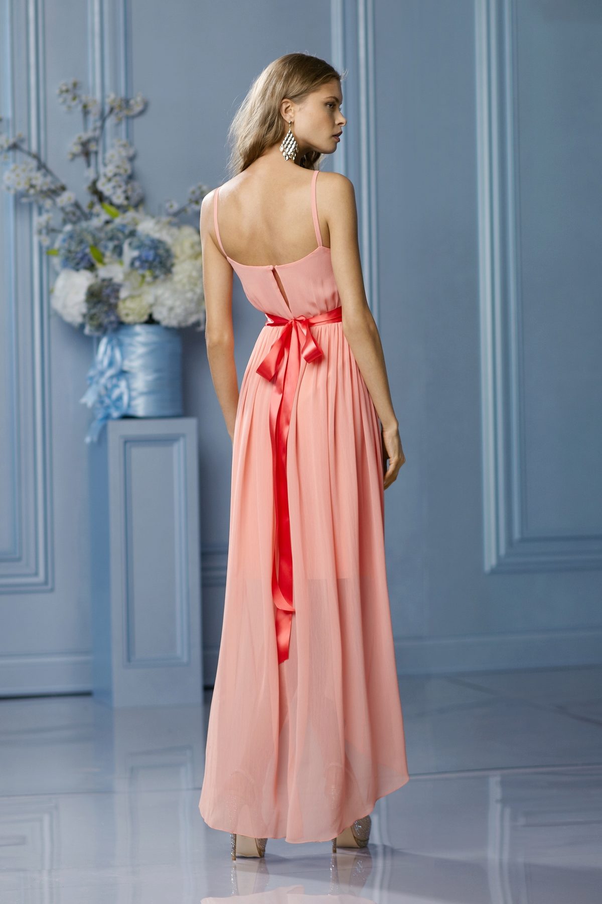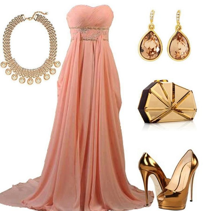 If the peach dress is floor-length with elements of embroidery or lace inserts, jewelry should be used to a minimum, for example, to be limited to earrings.