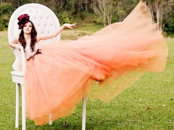 If you need an outfit for a festive event, then it is the dress of peach tone, the length of the floor will help to feel like a queen. The airy peach dress made of chiffon with draperies will make your image both sophisticated and luxurious.