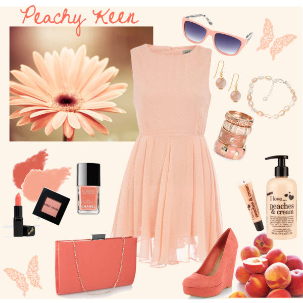 The peach color is rather soft, so it will be in harmony with both the dark complexion and pale skin. So the outfit in peach tone will suit a woman with any skin color. The thing is only in the right choice of the subtone.