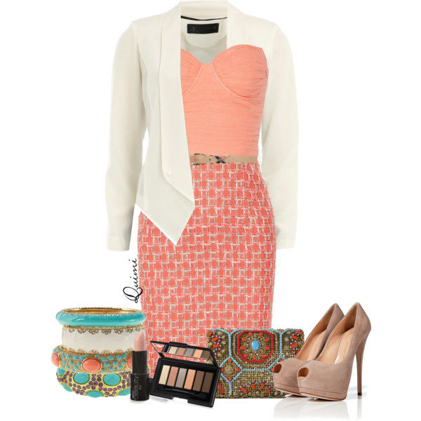 If you add a dress with a mini skirt in a peach tone with a cardigan or jacket, choosing discreet accessories for this, you will get an image that is suitable for friendly meetings and for the office.