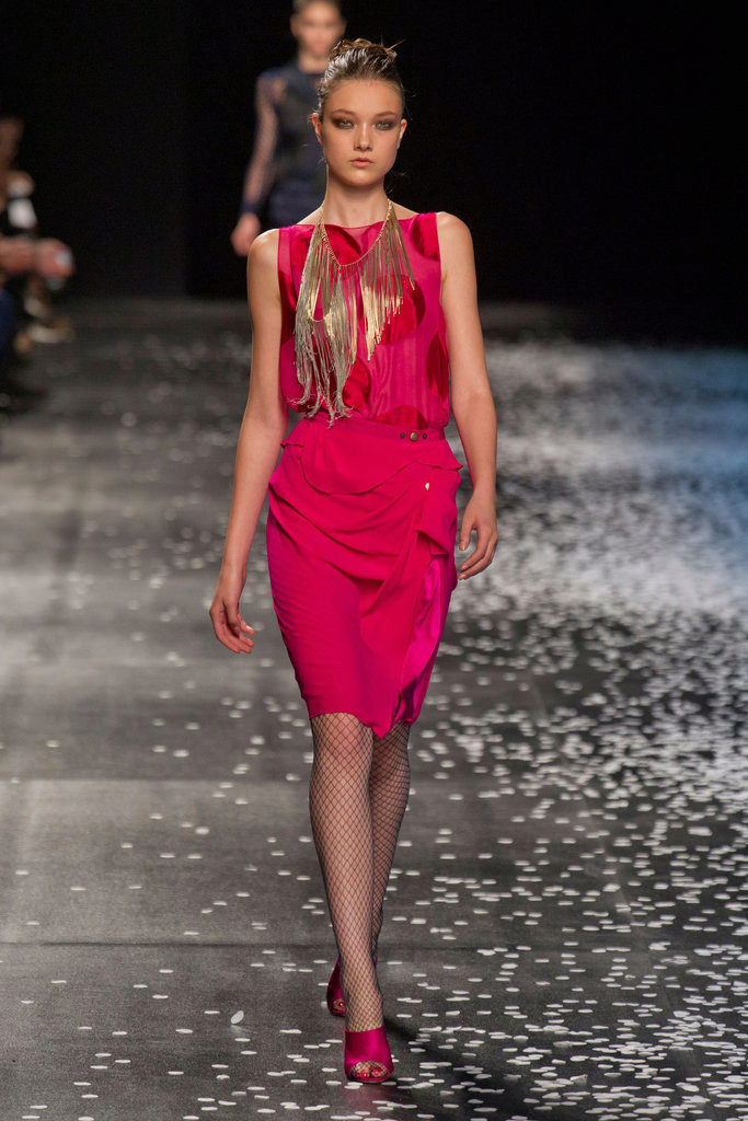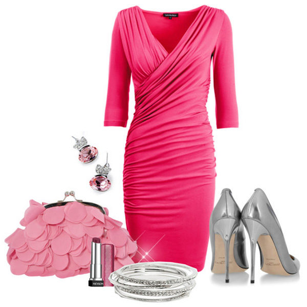Black heeled shoes will add slimness and grace. Most of all, they fit the deep pink color of the dress. But do not forget to capture the same color clutch and accessories.