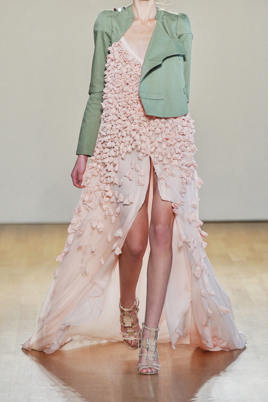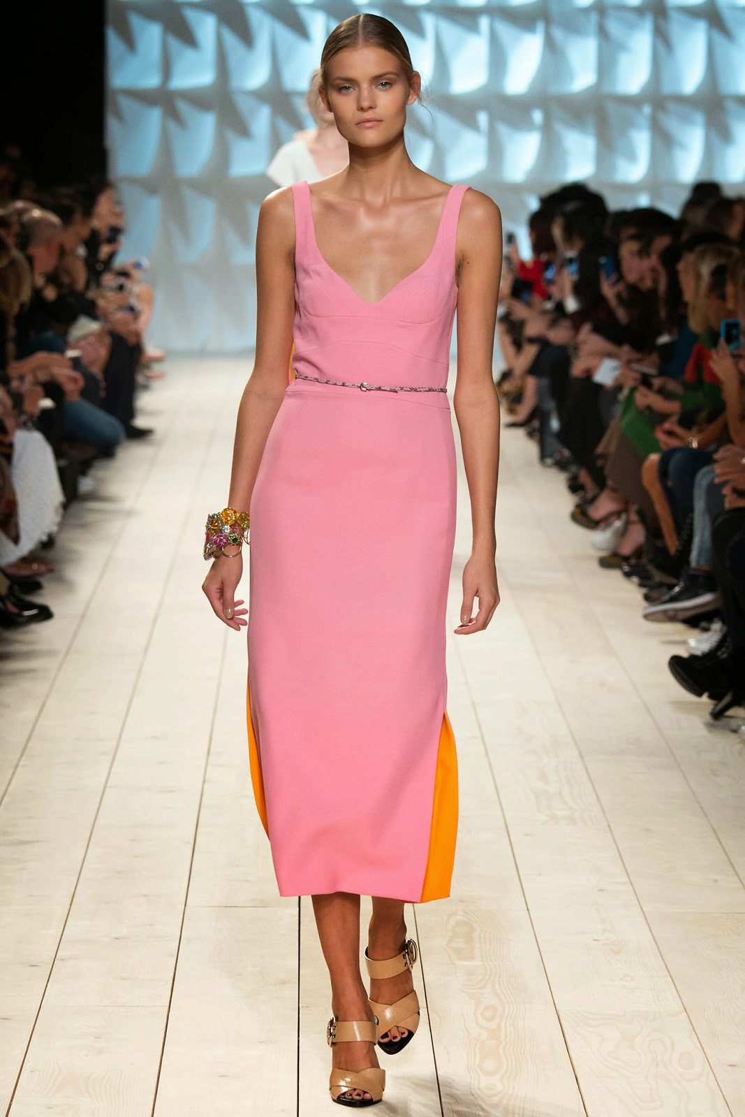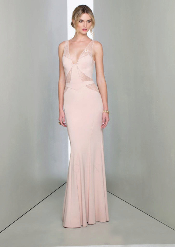 The dress fits perfectly with gold accessories. This particularly applies to the shade of pale pink.