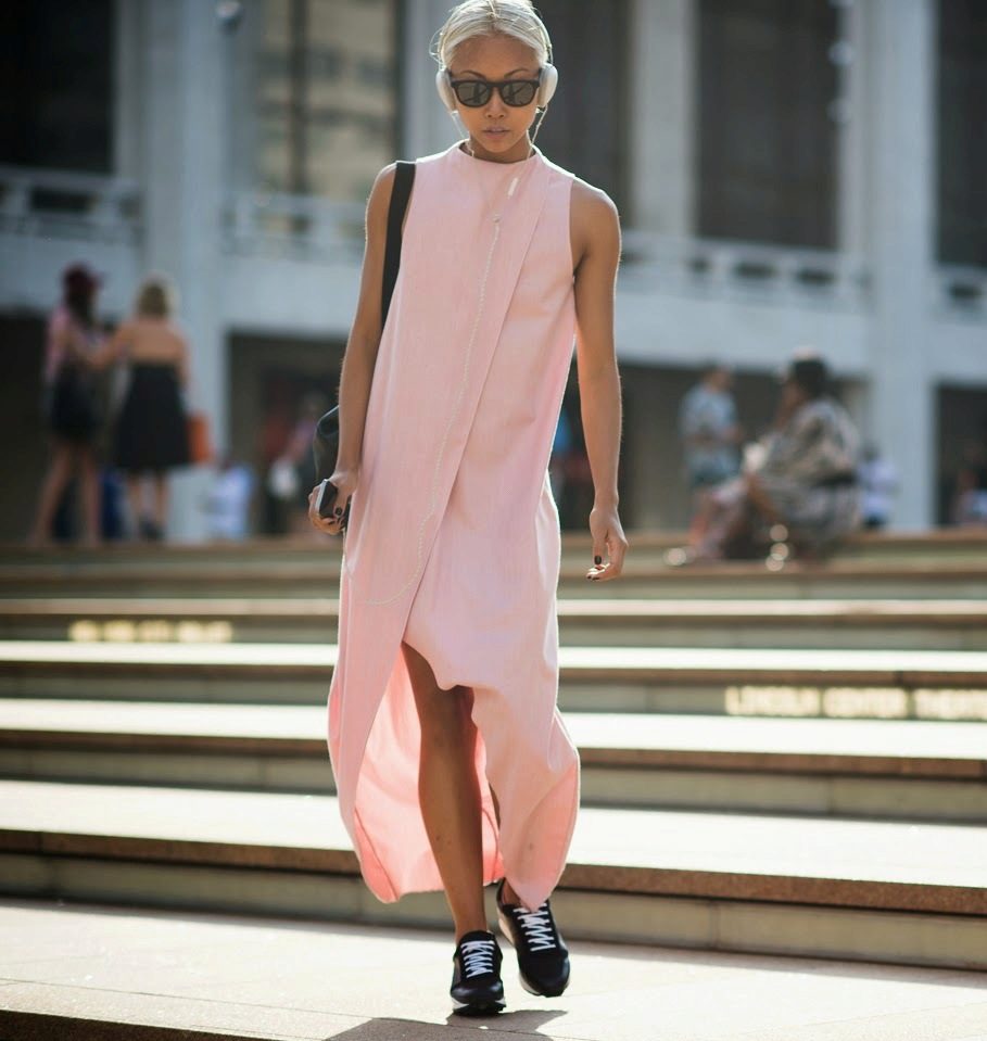 Pink dress with ballet shoes is the epitome of casual style, characterized by comfort and ease. The woman in them looks pretty and airy. Flying style and lightweight fabric will be the right decision. To complement the image add a cardigan and a roomy bag.