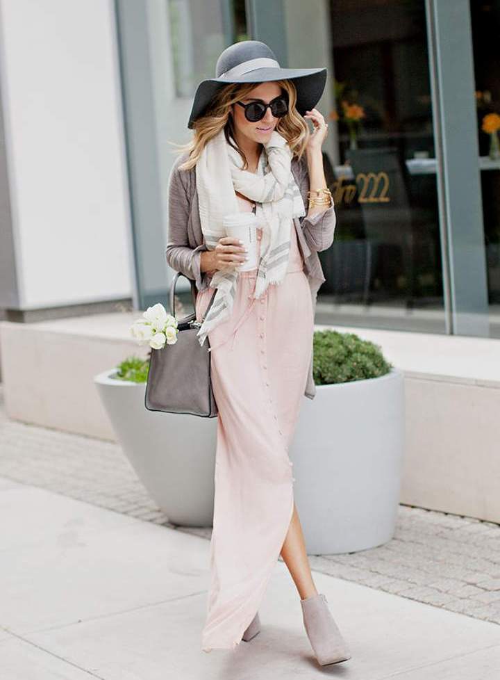Gray is very beautiful with a pastel shade of pink. This combination is appropriate for the cold season. A wonderful ensemble for the winter will be a pink dress, gray cardigan and boots. The image will turn out gentle and womanly.