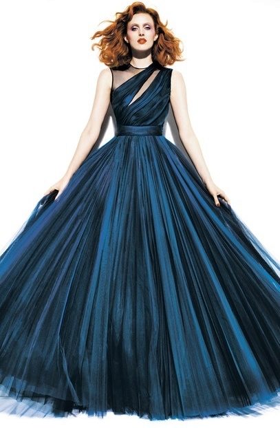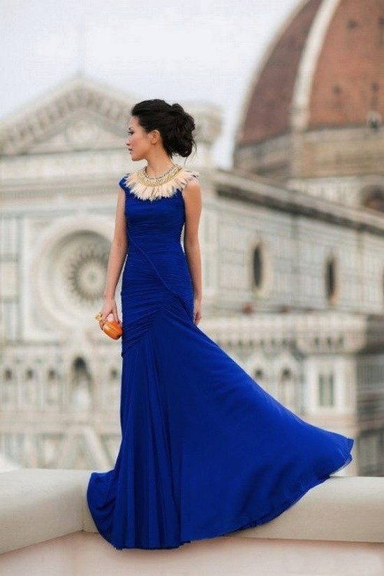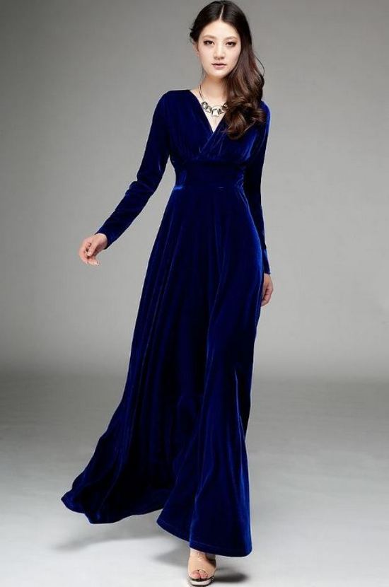 Velvet dress is most often long, form-fitting, with a beautiful neckline on the chest or on the back. You can wear your best jewelery along with blue velvet, but remember that glitter should be in moderation.
