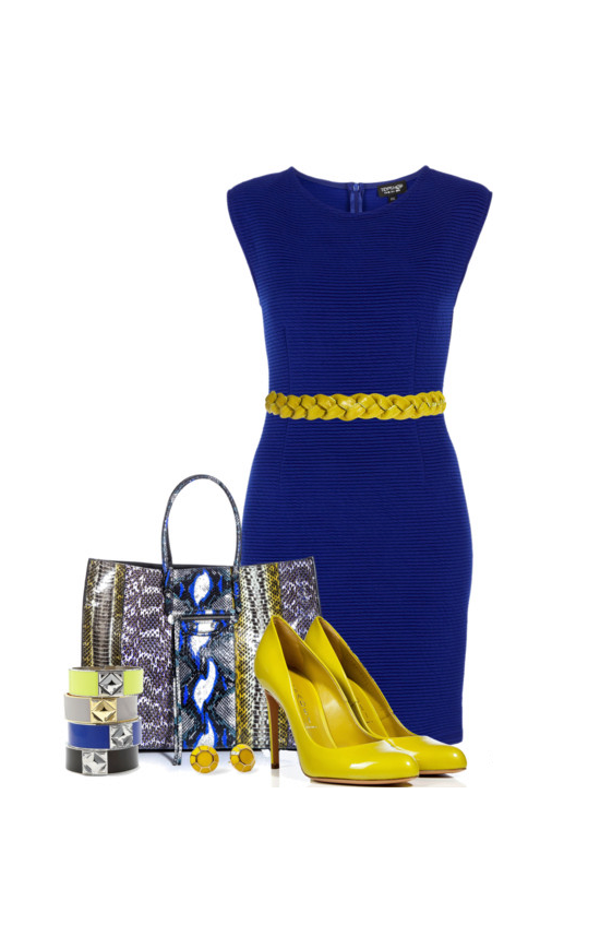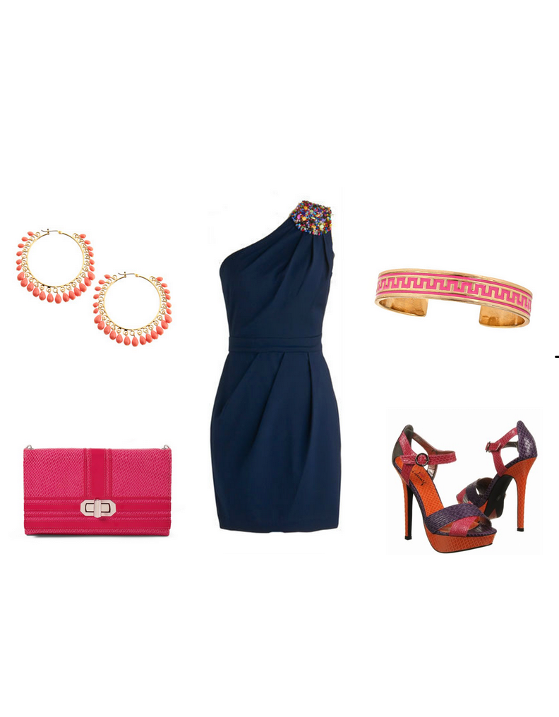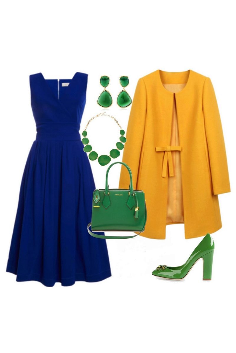 Dark blue color is perceived by many as very gloomy, so green accessories are a great way to “dilute” a dark outfit, make it more fresh and dynamic. Green shoes and a handbag are perfect for a dark blue dress.