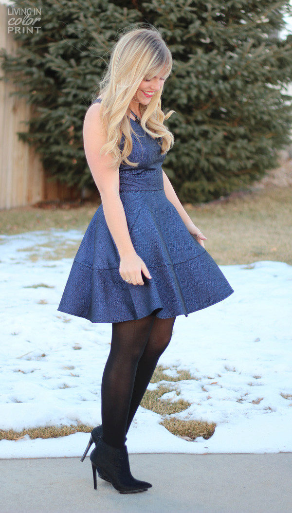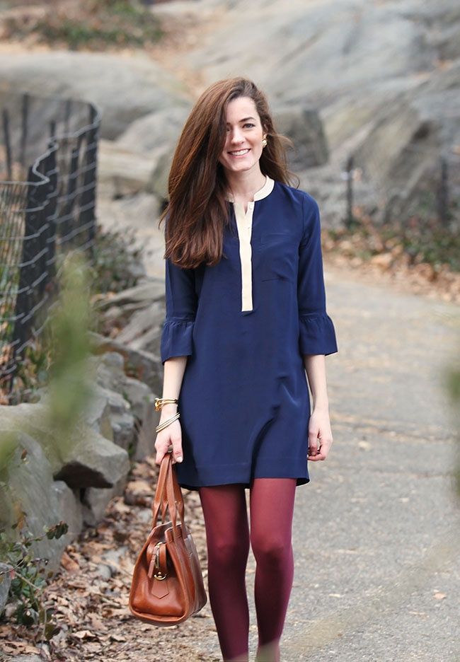 Tights for a dark blue dress should be chosen depending on the season. A universal option - it is thin body-colored tights or with a slight shade of tan.