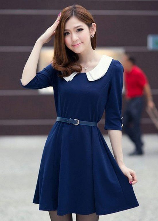 Dresses with a collar, despite the fact that they are usually associated with business style, look very cute. In this dress, even an adult girl can feel like a high school student. You can wear a navy blue dress with a collar for study and work, and after that appear in a meeting with friends. Collars may be of the same fabric as the dress, or may have a contrasting texture and color. Flirty ribbons on the collar, even a strict image will add lightness and romance.