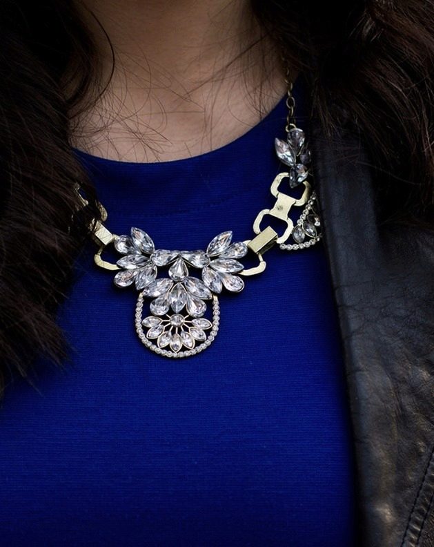 If we are talking about an evening dress, then jewelry made of gold and silver will perfectly suit him. Sapphires in white gold are in perfect harmony with the dark blue dress. For light, summer images fit a simple, but high-quality jewelry. For example, a romantic dark blue dress can be complemented with bright beads or large earrings made from multi-colored beads or stones.