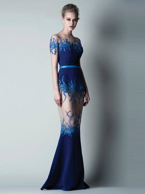 Dark blue lace can be a great outfit for a cocktail or gala evening. A lace dress in front closure looks very beautiful, but with a deep neckline at the back. Such a dress is the most suitable occasion to demonstrate a beautiful posture. Those who do not like openwork dresses can recommend models with lace details, for example, with guipure sleeves.
